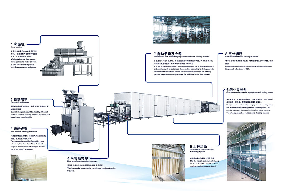 該生產線可用于生產江西米粉、桂林米粉等直條米粉用,產品直徑從1.0mm到1.6mm可調,生產出的直條米粉質地緊密、外形均勻、條型整齊、口感滑爽Q彈,可煮可炒。生產線設計科學、工藝合理、操作簡單、使用人工少、故障率低、自動化程度高,可實現生產過程標準化。除可生產普通米線外,本生產線還可用于紅米、黑米等其他復配原料的生產,為廣大消費者提供更多的選擇。